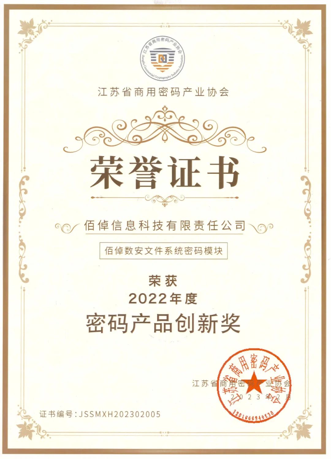 2月16日,在江苏省商用密码产业协会举办的年度会议上,佰倬信息科技公司的佰倬数安文件系统密码模块荣获“2022年度密码产品创新奖”。